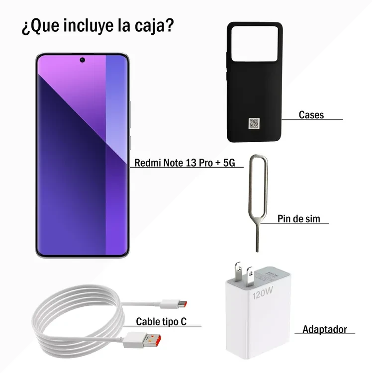 *Los productos que se muestran en esta página son solo de referencia y pueden no reflejar el producto real. El color y el acabado del producto real pueden variar ligeramente en diferentes entornos. *Las imágenes creativas de las características que aparecen en la página son solo ilustrativas y no representan la estructura real. Las imágenes son solo de referencia. *El dispositivo con resistencia al polvo y salpicaduras IP54 está certificado como resistente a salpicaduras y polvo exclusivamente bajo condiciones específicas de laboratorio que no corresponden a condiciones normales de uso. La garantía no cubre daños causados por líquidos en condiciones distintas a las condiciones de prueba. Para obtener más información, consulte el sitio web oficial de Xiaomi. *Recomendamos que no pruebes la resistencia al agua tú mismo. No recomendado para uso en la playa o la piscina. La protección de ingreso podría deteriorarse debido al uso diario, daños físicos y/o el desmontaje necesario en caso de reparación. La garantía no cubre daños causados por líquidos en condiciones distintas a las condiciones de prueba. Para obtener más información, consulte el sitio web oficial de Xiaomi. *La memoria y la capacidad de almacenamiento disponibles reales pueden variar o reducirse debido a una serie de factores: como el sistema operativo ocupa parte de la memoria (RAM), el espacio disponible real es menor que la capacidad de memoria indicada; Como el sistema operativo y los programas preinstalados ocupan parte de la memoria flash (ROM), el espacio de almacenamiento disponible real es menor que la capacidad indicada para almacenamiento flash. *Todos los datos de esta página sobre carga y duración de la batería se obtienen de los laboratorios de Xiaomi. Los resultados reales pueden variar según las diferencias en la versión del software, el entorno y el modelo de teléfono, y pueden no reflejar los del producto real. *La disponibilidad de NFC puede variar según el país y la región. *5000 mAh se refiere al valor típico de la capacidad de la batería del Redmi Note 13 Pro+ 5G. *El monitoreo de la frecuencia cardíaca funciona cuando el usuario presiona el área del sensor de huellas dactilares con el dedo. Este producto no es un dispositivo médico. Los datos y resultados de las pruebas son solo de referencia y no deben utilizarse como base para el diagnóstico y el tratamiento. *5G requiere el soporte de los servicios de operadores de telecomunicaciones locales y es posible que no esté disponible en todas las regiones.